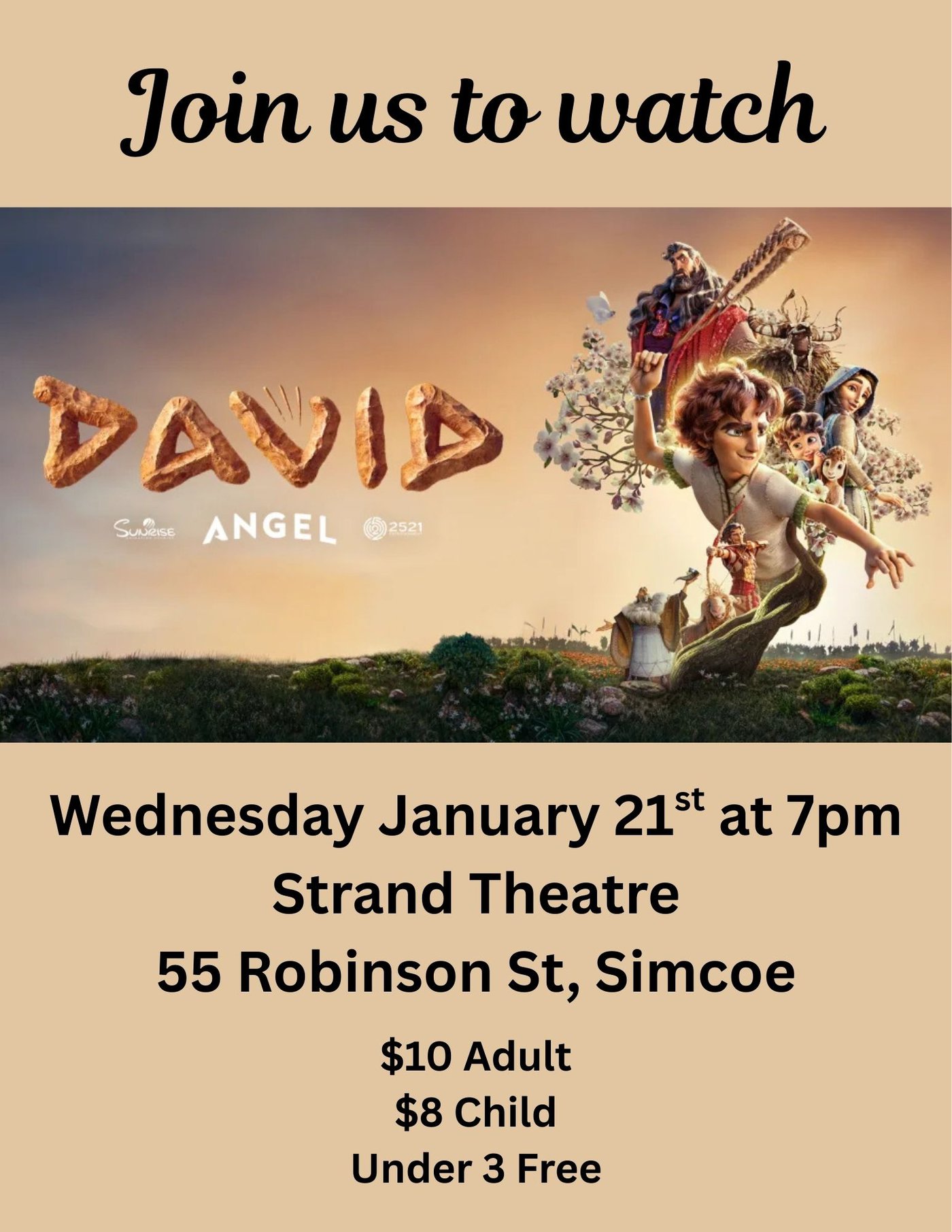 Youth Group would like to invite the church to join us in seeing David at the Strand Theatre. This is a great opportunity to invite your friends and neighbours, or bring your grandkids. No registration is necessary, meet us at the theatre on January 21st. If you are unable to join us on the 21st the movie will be showing other days also.